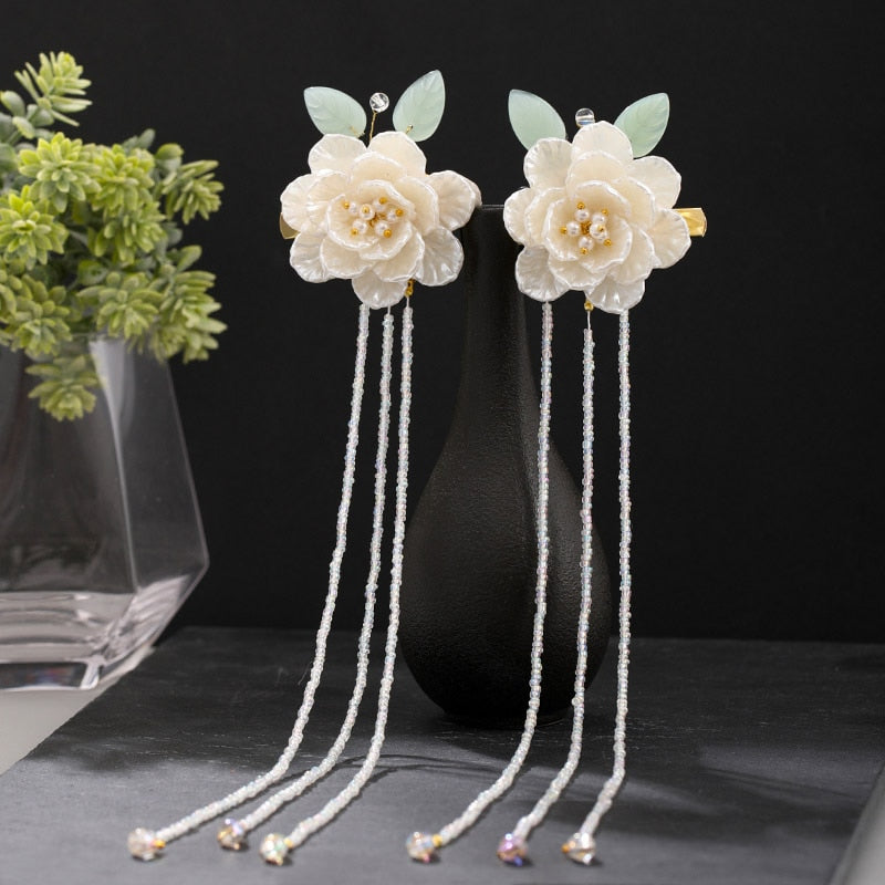 White Flower Leaf Pearls Long Tassel Hairpin Clips